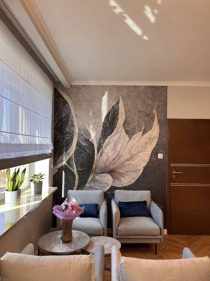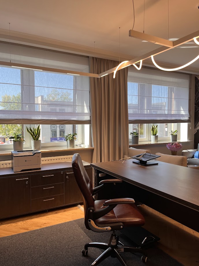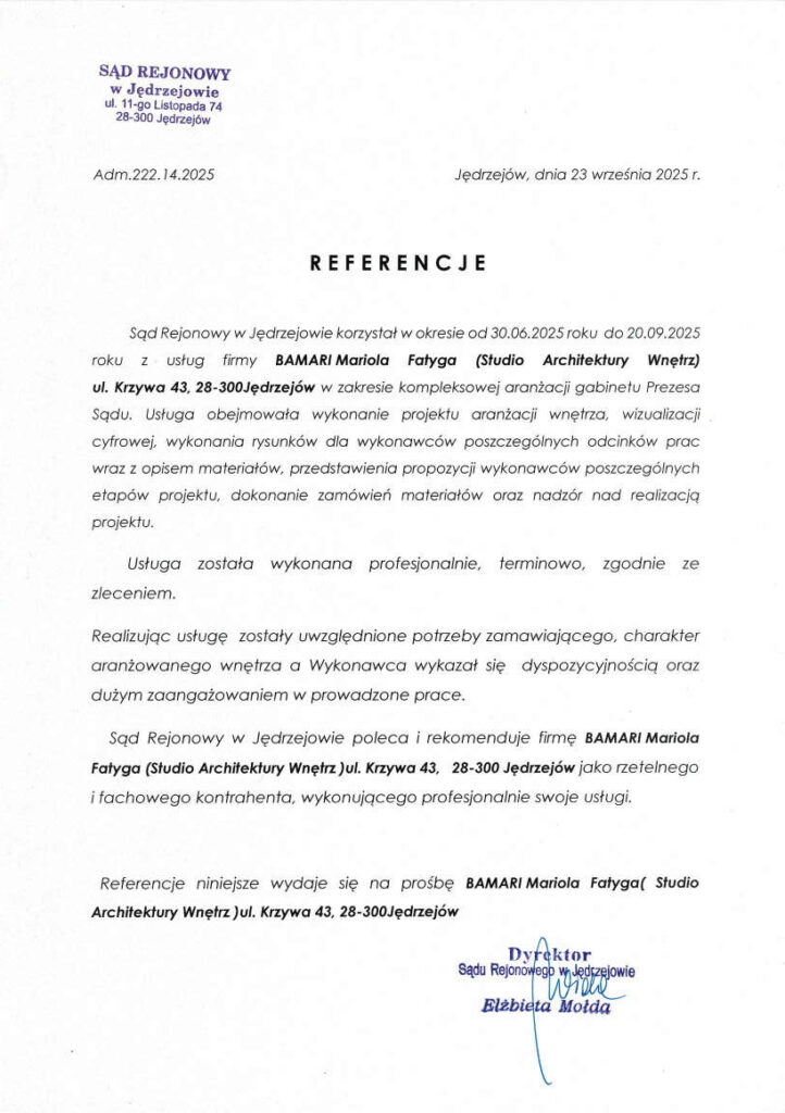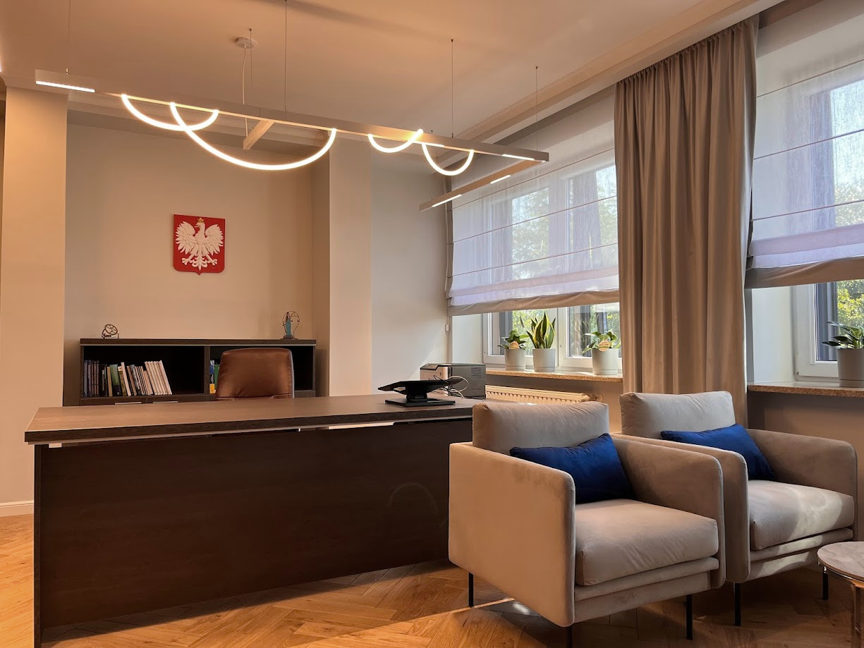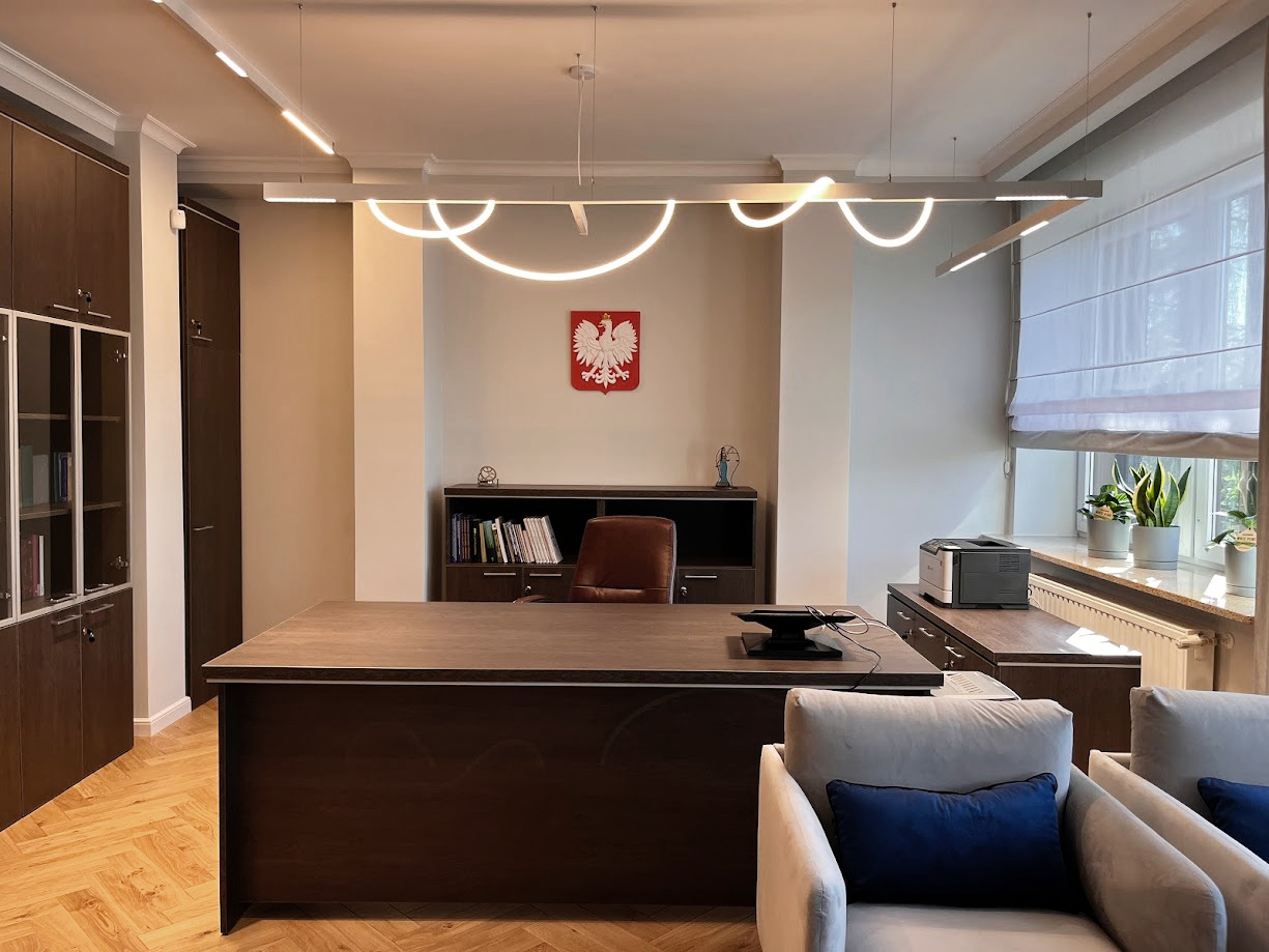 Projekt gabinetu Pani Prezes Sądu to reprezentacyjna przestrzeń, w której autorytet urzędu harmonijnie łączy się z elegancją i nowoczesnym podejściem do aranżacji wnętrz. Punktem centralnym jest obszerne, minimalistyczne biurko o wyrazistej, geometrycznej formie, podkreślające rangę stanowiska i porządkujące układ funkcjonalny pomieszczenia. Wnętrze utrzymane zostało w stonowanej, ponadczasowej kolorystyce. Naturalna, drewniana posadzka ułożona w klasyczną jodełkę wprowadza ciepło i szlachetność, równoważąc nowoczesne elementy wyposażenia. Dekoracyjna ściana z subtelnym, artystycznym motywem roślinnym nadaje przestrzeni indywidualny charakter, przełamując formalny ton wnętrza i budując jego prestiżowy wizerunek. Zaprojektowane indywidualnie oświetlenie sufitowe stanowi zarówno element funkcjonalny, jak i designerski akcent kompozycyjny. W gabinecie wydzielono również kameralną strefę spotkań z wygodnymi fotelami, sprzyjającą rozmowom, naradom. Całość tworzy przestrzeń spójną, elegancką i wyważoną — miejsce pracy, które podkreśla rangę funkcji Pani Prezes Sądu, a jednocześnie zapewnia komfort i atmosferę sprzyjającą skupieniu.