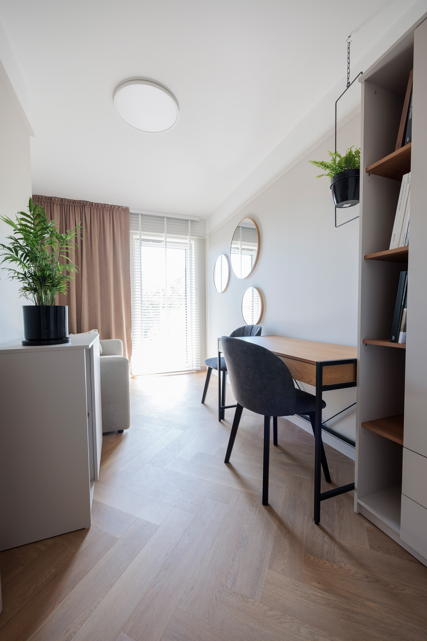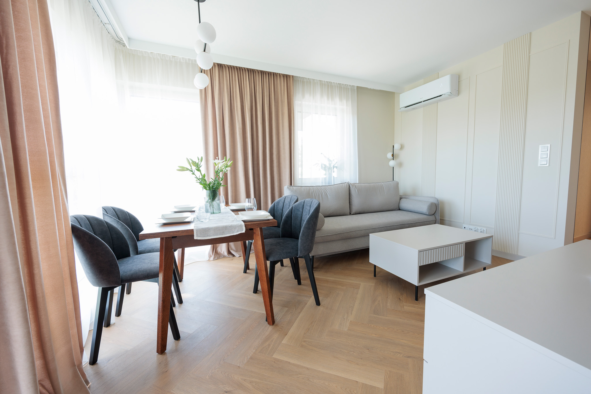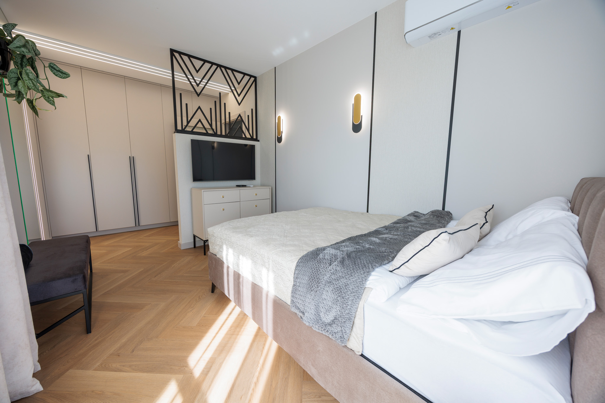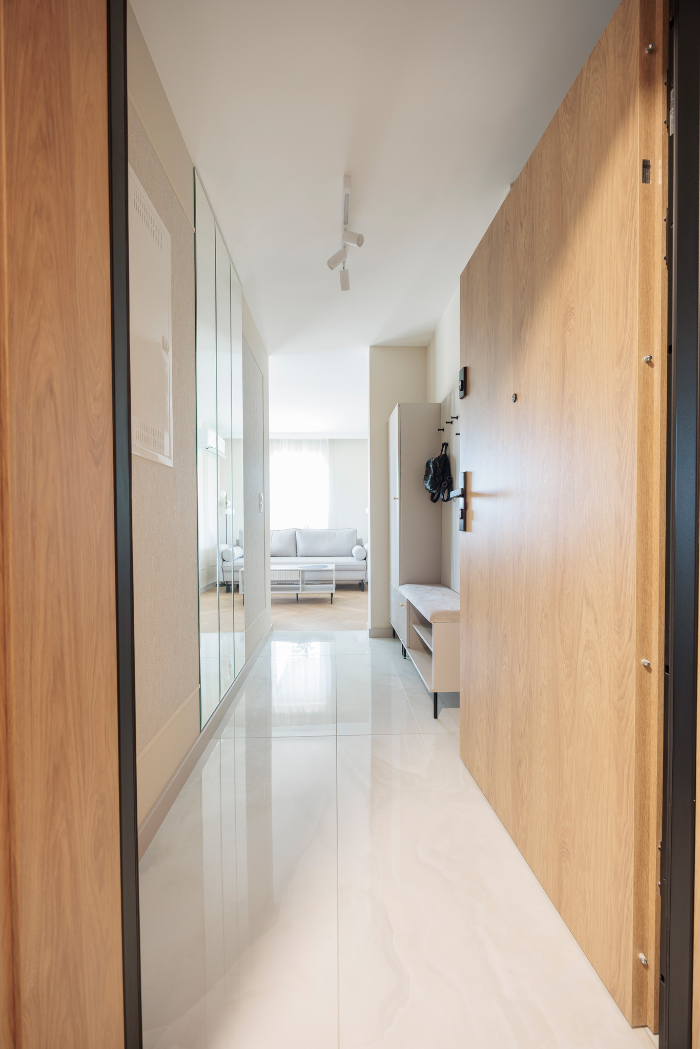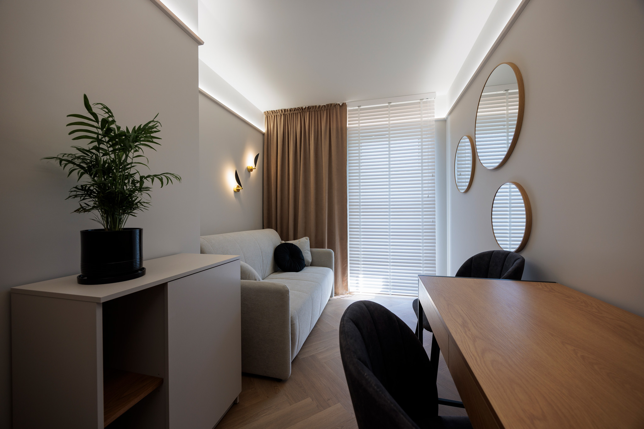 Projektowane mieszkanie o powierzchni 64 m² zlokalizowane jest na trzecim piętrze bloku, tuż obok zalewu w Jędrzejowie. Prace projektowe rozpoczęliśmy od subtelnych zmian w układzie funkcjonalnym, które pozwoliły nie tylko na wygospodarowanie dodatkowej toalety dla gości, ale także na jeszcze lepsze dopasowanie przestrzeni do codziennych potrzeb inwestora. Kluczowym założeniem było uzyskanie maksymalnej funkcjonalności wnętrza oraz stworzenie rozwiązań ułatwiających utrzymanie porządku — projekt powstał z myślą o samotnym mężczyźnie w starszym wieku, dla którego komfort, ergonomia i intuicyjna organizacja przestrzeni mają szczególne znaczenie. We wnętrzu dominują ciepłe, neutralne barwy: beż, złamana biel oraz drewno w odcieniu naturalnego dębu. Starannie zaprojektowana zabudowa meblowa zapewnia dużą ilość miejsca do przechowywania, jednocześnie pozostając niemal niewidoczną w odbiorze. Dzięki temu przestrzeń jest uporządkowana, harmonijna i łatwa w codziennym użytkowaniu. Całość utrzymana jest w estetyce wyważonej i ponadczasowej — wnętrza są pozbawione zbędnych ozdób, a jednocześnie pełne dopracowanych detali i subtelnych akcentów, które nadają im indywidualny, elegancki charakter.